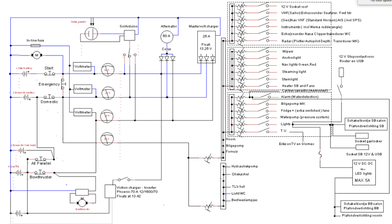 Noot: Het laden door het zonnepaneel en het meten/ regeling vinden plaats nabij de voltmeters. De werkelijke spanning op de accu's ligt lager. Bij dit project moeten de waarden ingesteld moeten worden naar gelang de specifieke situatie aan boord.