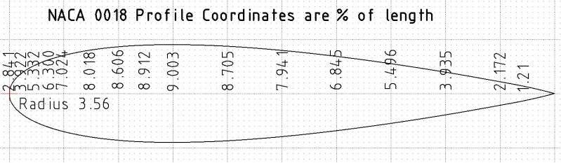 Publicatie MT521 van de TU Delft, was één van mijn leidraden. In hoofdstuk 12 worden diverse onderzoeken betreffende roerprofielen beschreven. Mijn keuze viel op een symmetrisch NACA0018 vleugelprofiel. Het getal duidt op de grootste dikte als percentage van de koorde - In ons geval 18% van 550 = 99 mm. De x> y coördinaten van een NACA0018 profiel, als % van de koorde, bedragen: