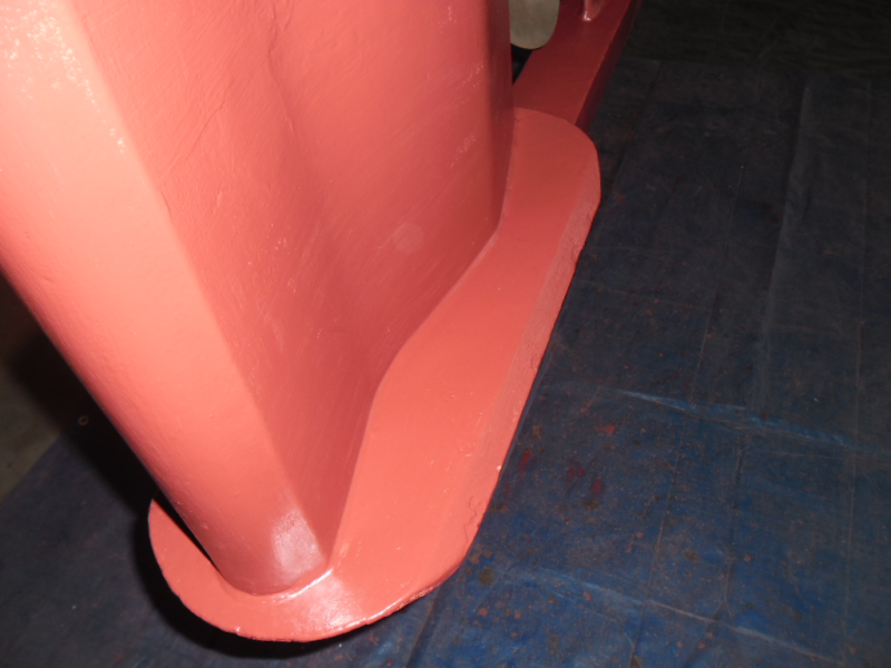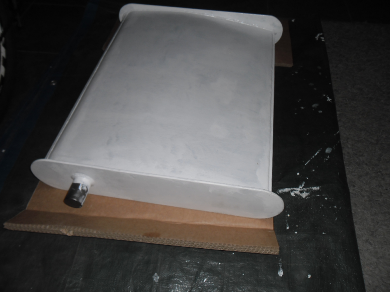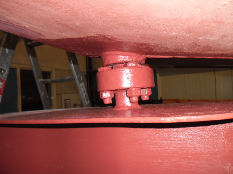 Voor het geval er ooit water binnendringt in het roer, bijvoorbeeld bij de flensverbinding, heb ik door de boutgaten verf in het roer gegoten. Daarna het roer in een rustig tempo alle kanten op gedraaid, zodat de, niet aan de binnenzijde afgelaste naden, opgevuld worden met verf. (Ik had hiervoor nog een pot twee-componenten polyurethaan verf met een kleur die ik niet meer zou gebruiken) Na dit "spoelen" van het roer met verf, het roer uit laten lekken door de boutgaten. Dit om te vermijden dat de poortjes aan de onderzijde van het roer dicht komen te zitten met verf. Het roer blijft daarmee eventueel aftapbaar in de gemonteerde situatie door een gaatje in de onderzijde te boren.