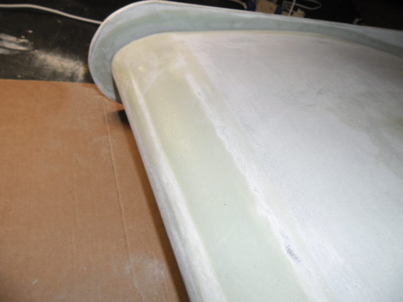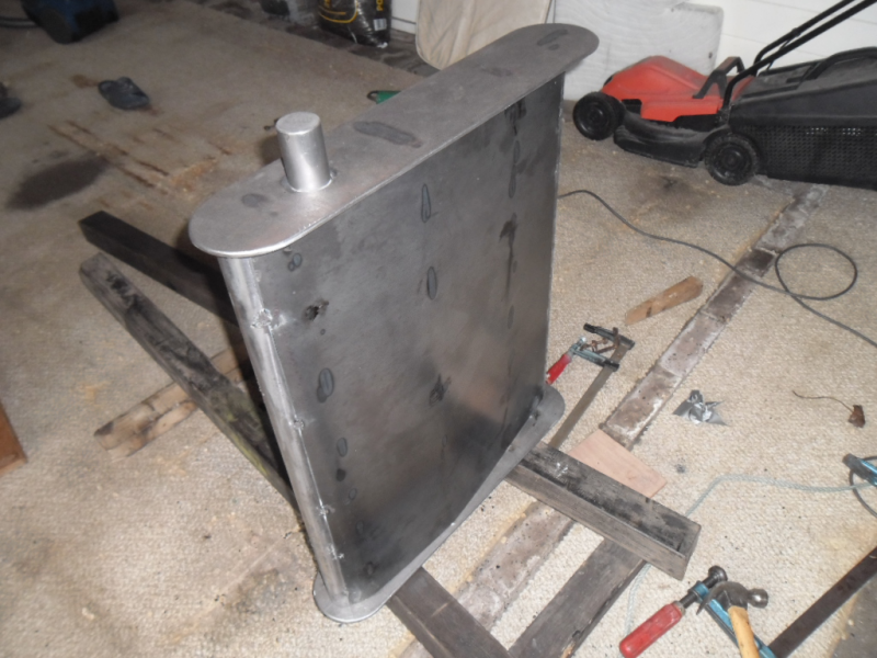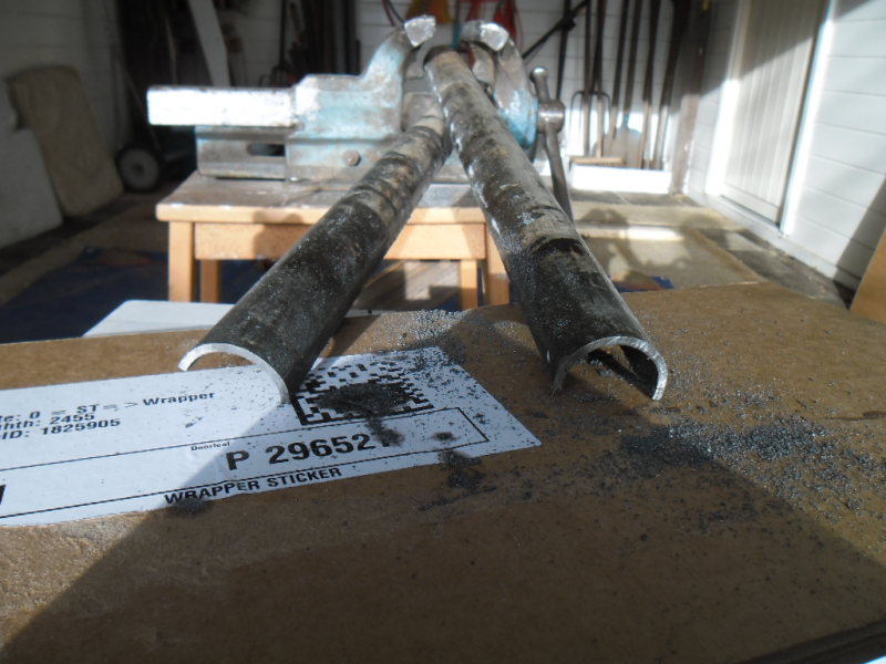 De las van het pijpsegment met de platen, heb ik iets binnen de strokende lijn van het nagestreefde NACA profiel laten vallen. Om een gladde strokende vorm te krijgen gaat mijn voorkeur namelijk uit naar het gebruik van wat epoxy plamuur, in plaats van het weg slijpen van (mogelijk te) veel lasmateriaal. De voorrand van de platen is daarom een fractie te ver naar binnen gebogen. (Dikke lagen plamuur onder water kun je bij de meeste soorten plamuur beter vermijden)