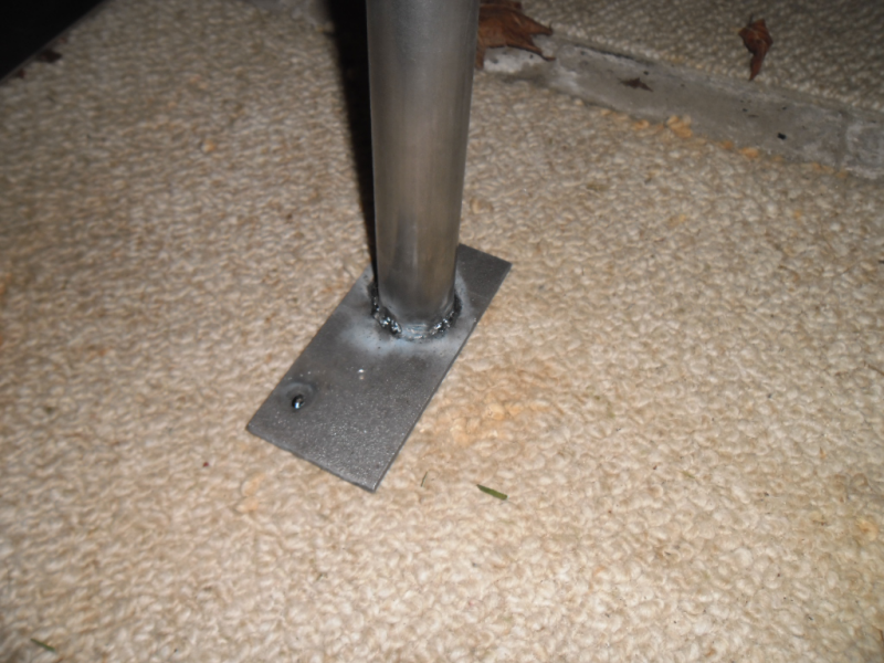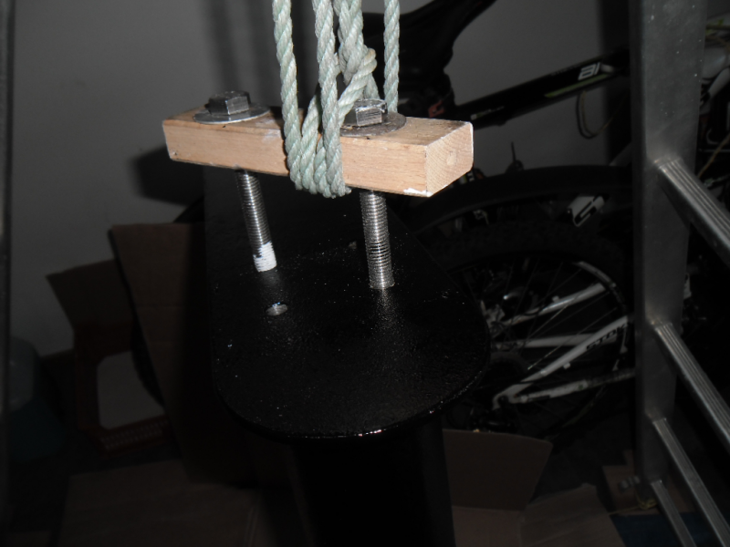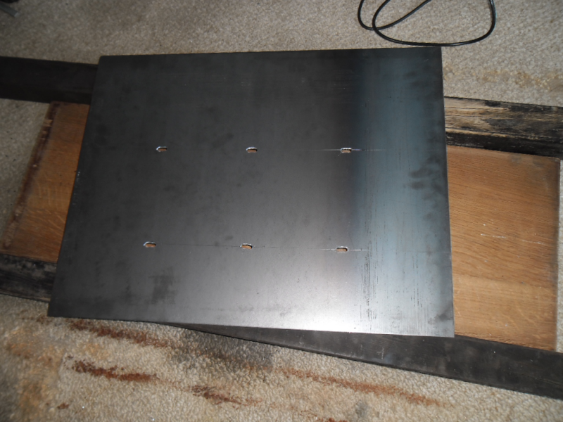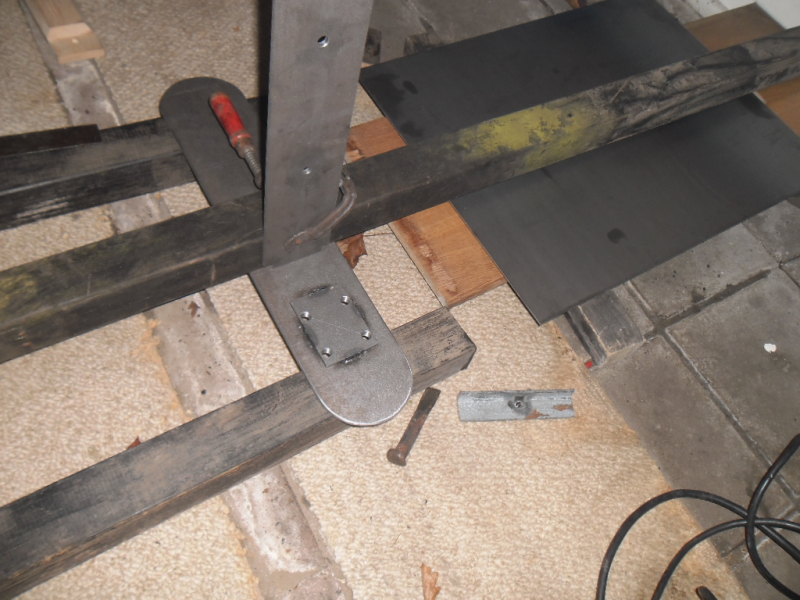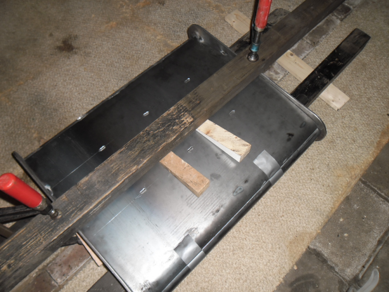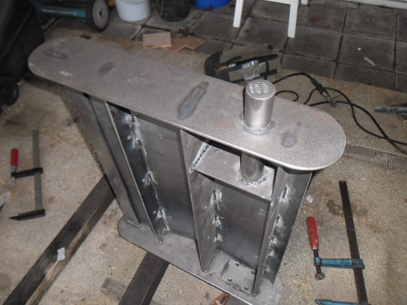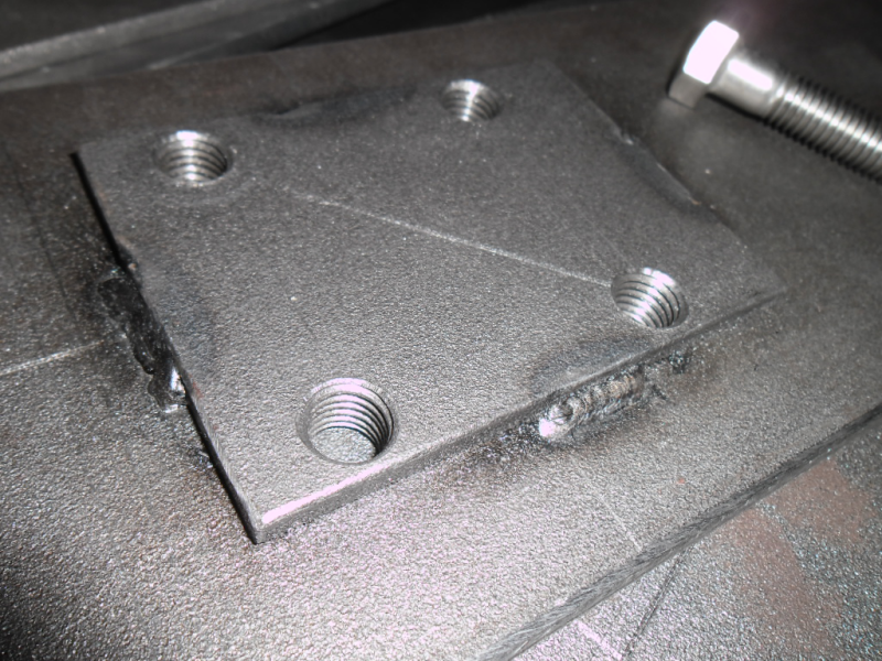 Het dubbelplaatje precies op de correcte plaats aan de onderzijde van de top plaat vast gelast en doorgeboord: 4-6-8-10.5. De gaten daarna voorzien van schroefdraad M12.